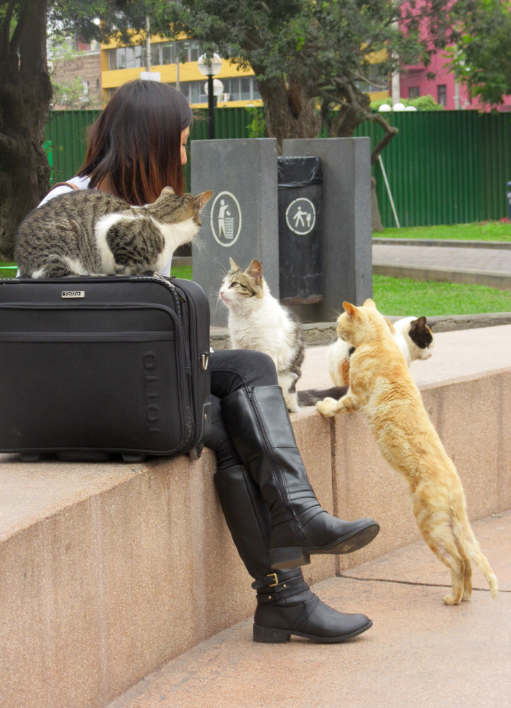 This young woman had just one on her briefcase until she opened her lunch. City veterinarians regularly monitor the cats’ health.
