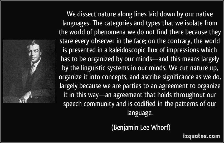 So one day I found myself sitting in a linguistics classroom, having just been introduced to the genius of Benjamin Lee Worf, a pillar of US language and thought. Worf developed what he called “Linguistic Relativity” which argued that one’s perception of the world is entirely mediated by one’s language. A northern European cannot comprehend the realities of an African Bushman anymore than a Tokyo businessman can truly know the ontology of an Anatolian shepherd. Makes sense to me. So much so, that I considered changing my major from psychology to linguistics.