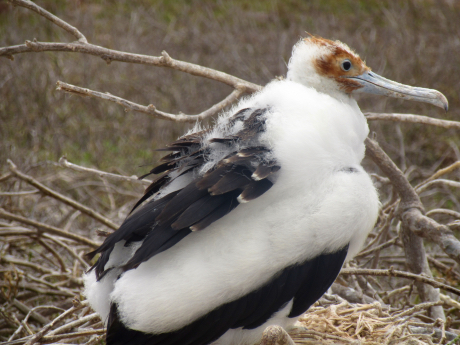 Young Frigate Bird ← Previous Next → Juvenile Frigate Profile North Seymour is the home to many hundreds of nesting sea birds.